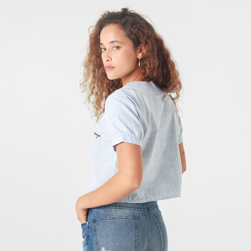 BLUSA CROP ESCOTE EN V CON IMITACION PECHERA Y BOTON DECORATIVO MANGA CORTA CON RECOGIDO EN PUÑO