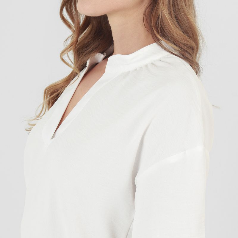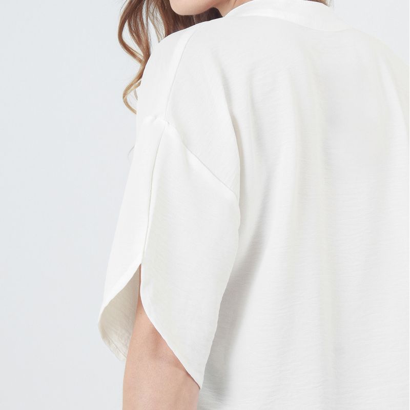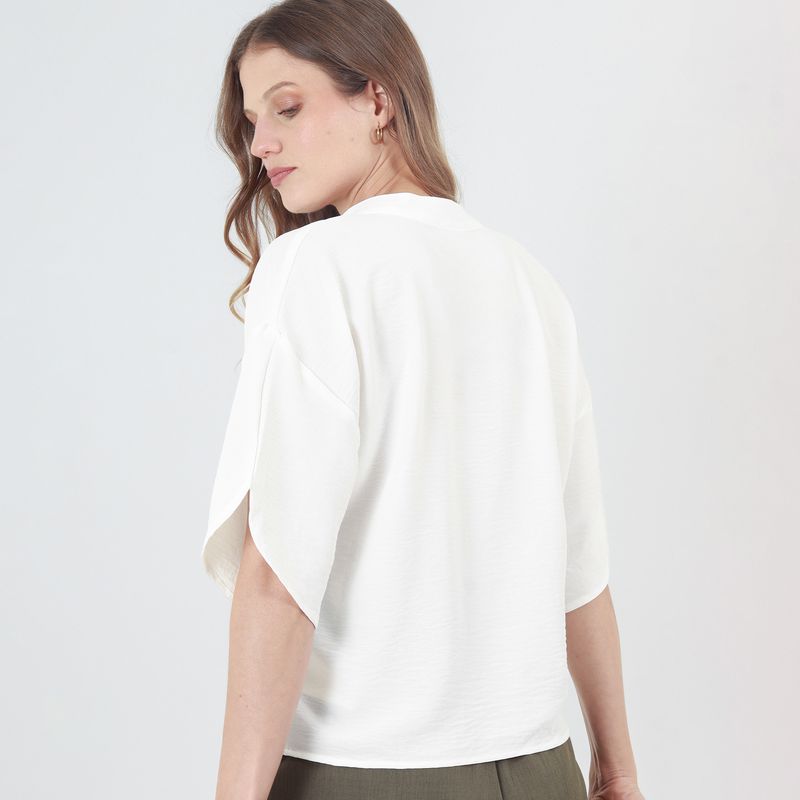 BLUSA MANGA CORTA RODADA CUELLO NERU CON ABERTURA EN DELANTERO Y RECOGIDO EN CUELLO DELANTERO
