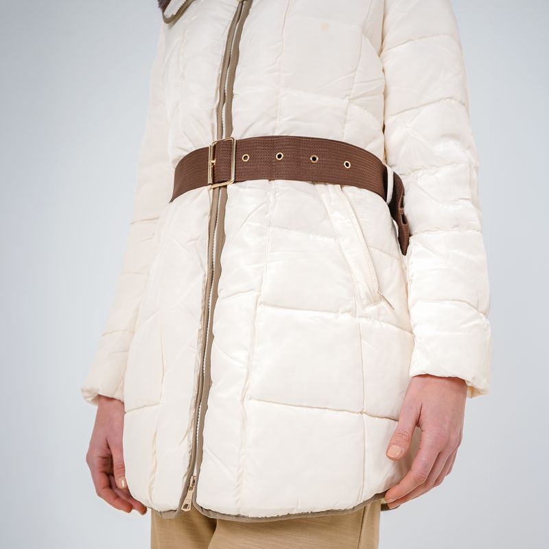 CHAQUETA DE CUELLO SUBIDO CON DETALLE PELO INTERNO. MANGA LARGA ACABADA CON PUNO INTERIOR. BOLSILLOS DELANTEROS DE VIVO CON CREMALLERAS Y FORRO INTERIOR. CIERRE FRONTAL CON CREMALLERA METALICA Y CINTURON EN LA MISMA BASE CON DETALLES METALICOS