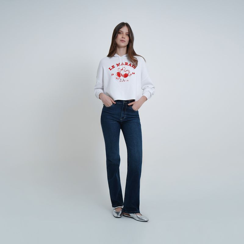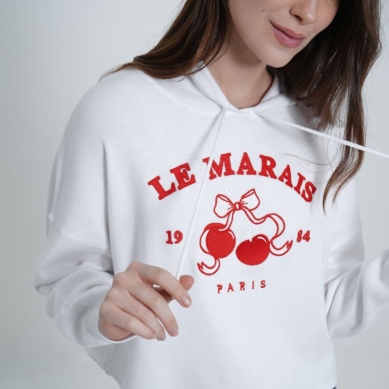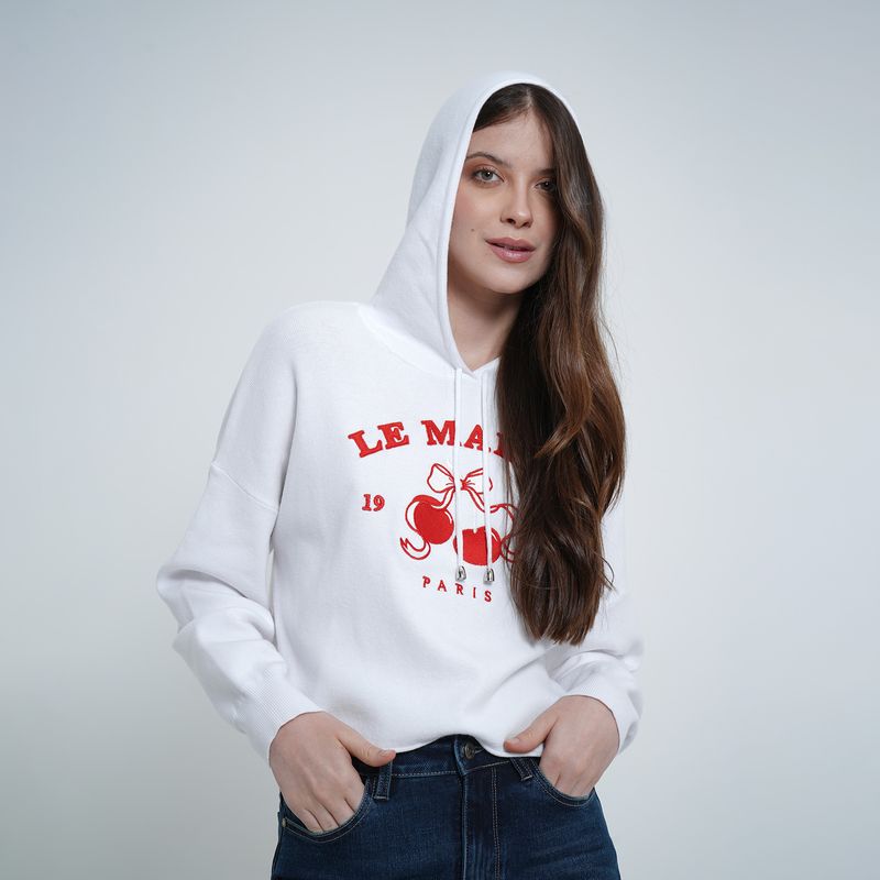SACO JERSEY CORTO MANGA LARGA, EN TEJIDO SUAVE CON BORDADO LOCALIZADO EN DELANTERO. SILUETA RELAX CAPUCHA AL ASIENTO. RIBETE ACANALADO EN PUNOS Y BAJO.