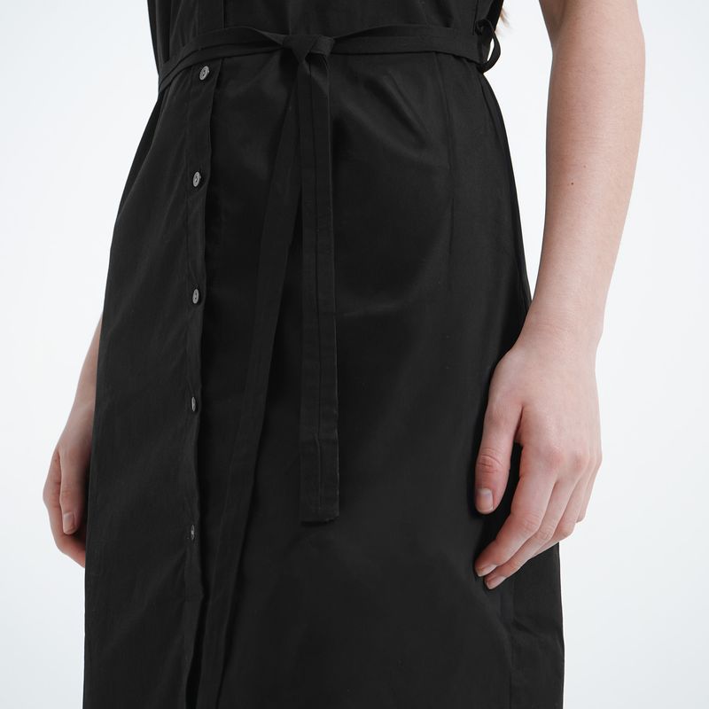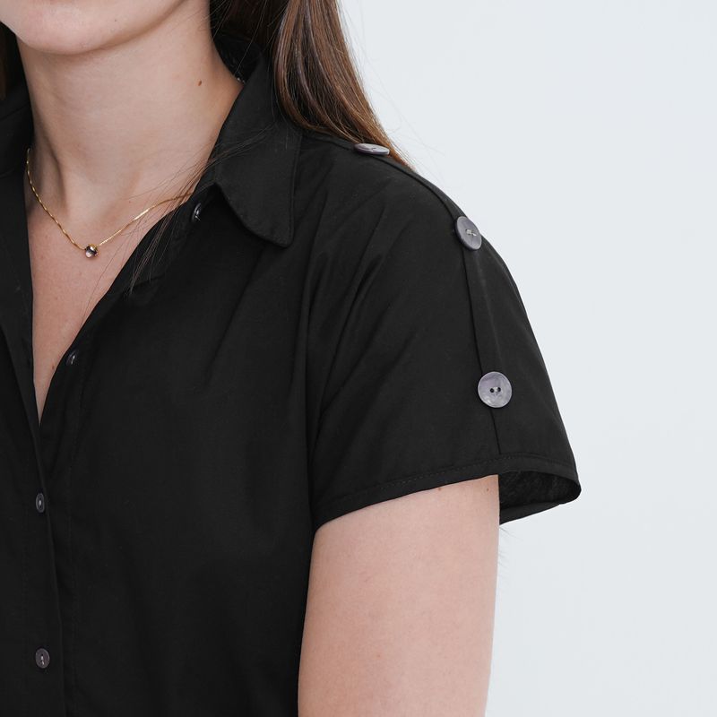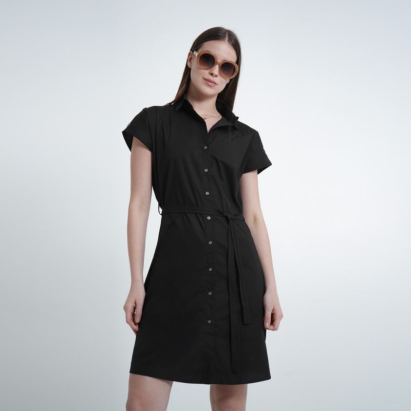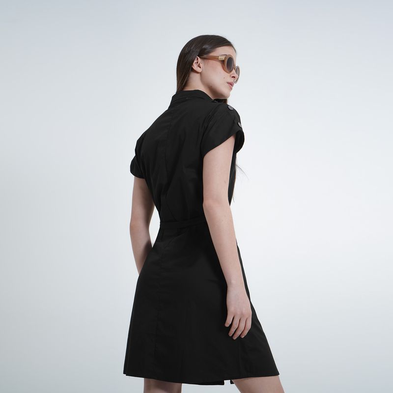VESTIDO MANGA CORTA RODADA CUELLO CAMISERO CON BOTONES EN DELANTERO Y EN HOMBRO Y LAZO PARA ANUDAR EN CINTURA